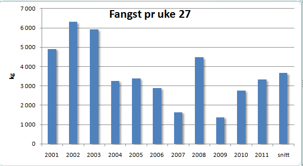 Figuren under viser fangstene pr 12 juli fra 2001 t.o.m. i år. Fangstene på begynnelsen av tiåret er basert på større fiskeinnsats og kan således ikke sammelignes direkte med årets fangster. Oppgangen i år er dermed relativt sett bedre enn det går fram av figuren.