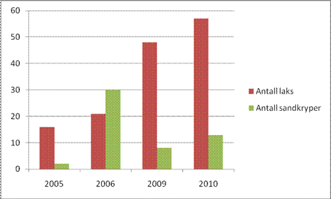 Antall fangede lakseunger totalt sett var lavere enn i 2009, men dette kan skyldes lavere vannføring ved gjennomføring av fisket. Dette både fordi grunt vann vanskeliggjorde fisket noe, samtidig som lakseungene kan ha trukket ut til områder med større strømhastighet. Lavere strømhastighet kan forklare at det ble fanget flere ørekyte og gullbust enn i fjor. Dette kan også forklare at andelen sandkryper i forhold til lakseunger i år var fordoblet i forhold til i fjor. Andelen sandkryper var 12% i 2010 og 6 % i 2009. Samtidig kan høyere vanntemperatur ha favorisert sandkryperen. Resultatene tyder i hvert fall på at sandkryperens veksthastighet kan ha økt i forhold til i fjor. Vi ser at både sandkryperens gjennomsnittlige lengde og skillet mellom lengden av fjorårsfisk og eldre fisk har økt.